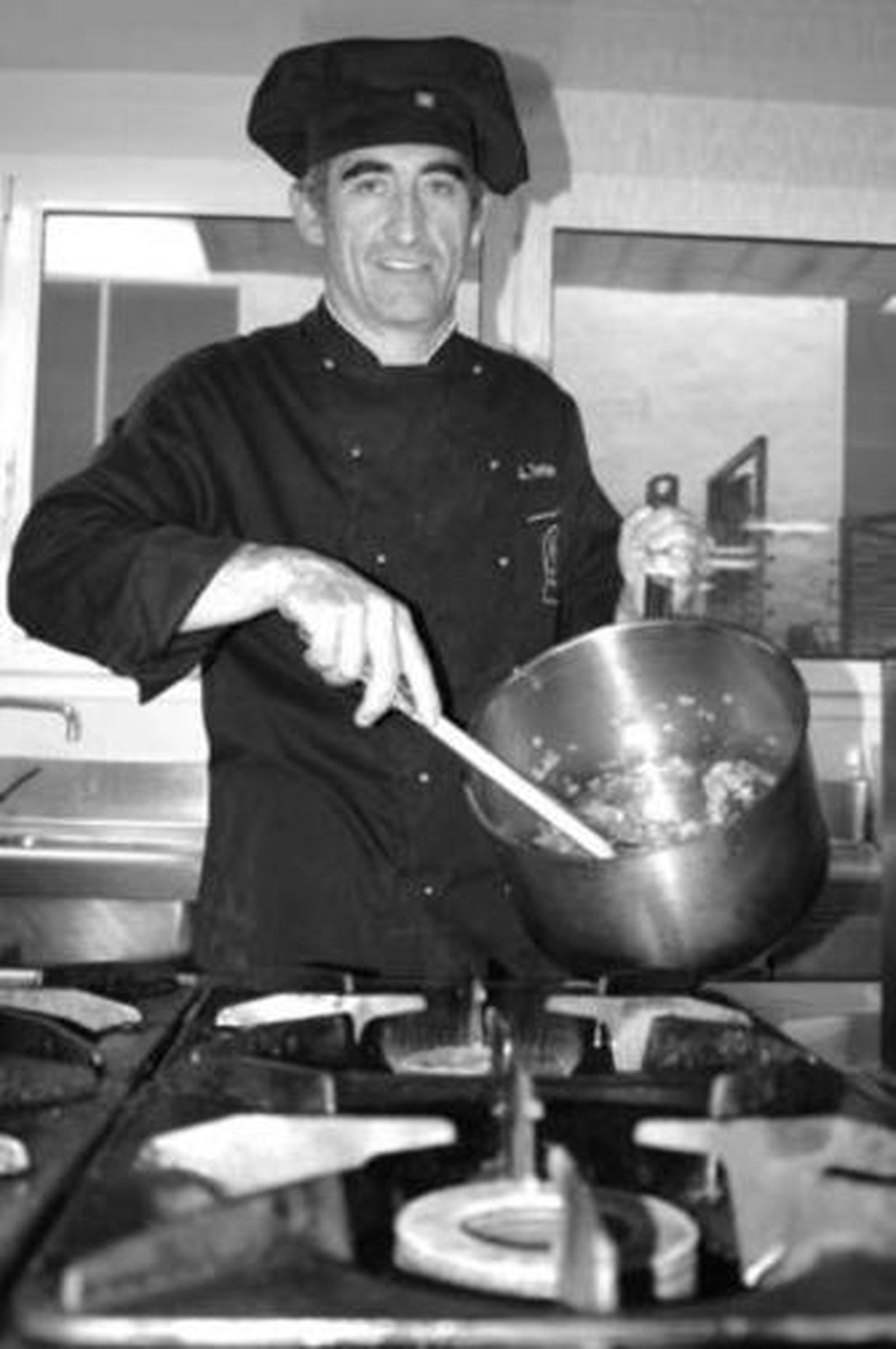 · Rehogar la cebolla y el puerro, agregar la tinta de calamar y el pán previamente frito con el fumet, cocer y triturar hasta que quede una salsa negra brillante, cocer los calamares en esta salsa y reservar. Empapar el pán de molde de la salsa anterior, hornear muy flojo hasta que quede tostado, dejar enfriar y pulverizar. Elaborar la leche quemada poniendo una cazuela al rojo vivo, añadir un poco de leche y dejar quemar un poco, repetir dos veces más la operación, agregar el resto de leche y las colas hidratadas y reservar moviendo bastante para crear espuma. Confitamos el bacalao a baja temperatura ( 60 grados) durante 5 minutos.