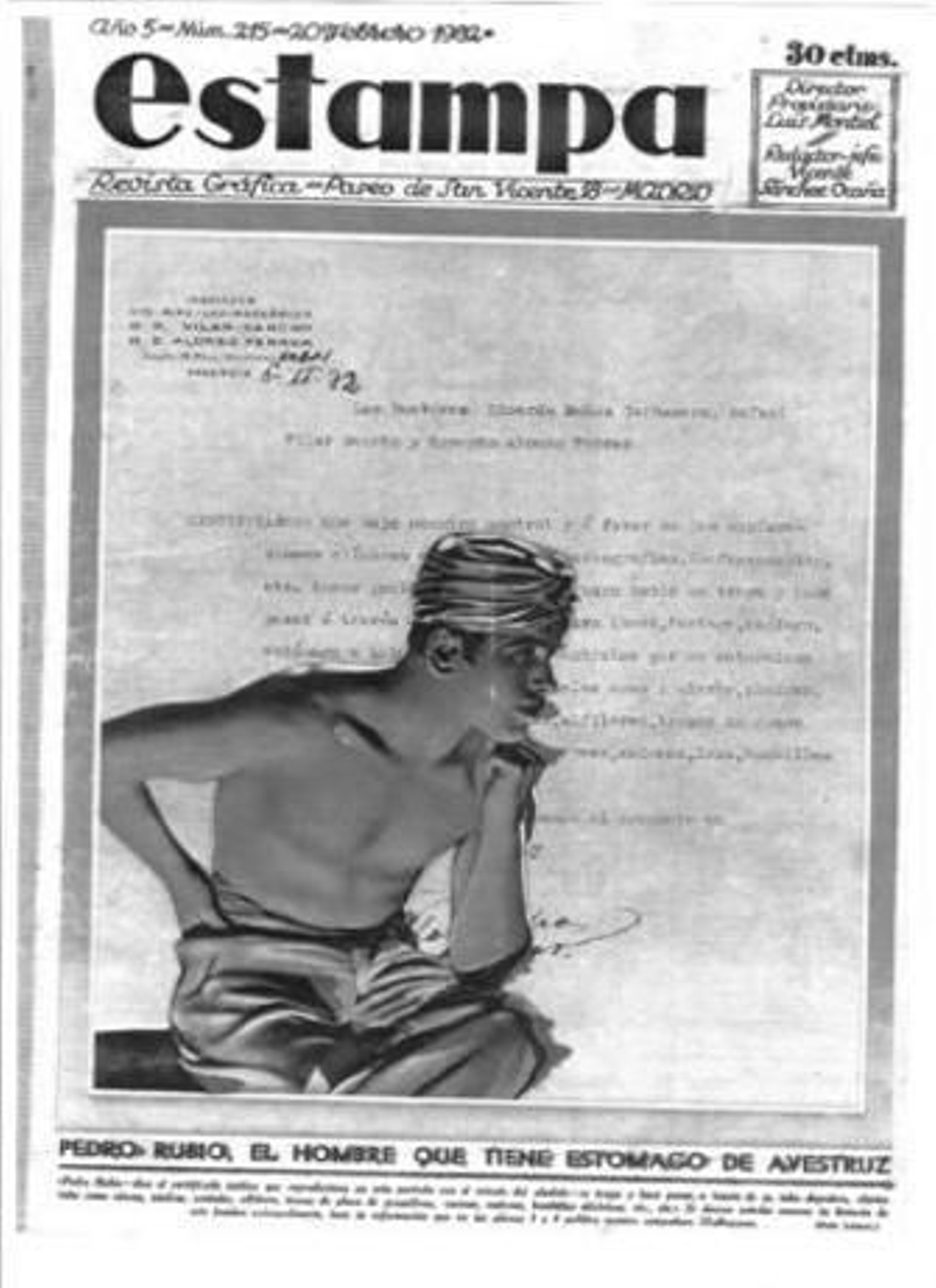 El ejemplar del semanario gráfico "Estampa" que ilustra la crónica cayó en mis manos y me picó la curiosidad. ¿Quién era el faquir Pedro Rubio, paisano de la desembocadura del Almanzora? Me hice con sendos ejemplares de El Castellano (1933) y El Telegrama del Rif (1935), diarios de Toledo y Melilla, y algo supe del sorprendente "estómago de avestruz". A mis amigos de la revista Axarquía les brindo la noticia por si les apetece profundizar en su biografía. Su gracia ya está dicha: Pedro Rubio Pelegrín, nacido en 1913 en Cuevas (a pesar de que en los papeles se reitera "de Vera", lo omito en evitación de suspicacias). Hijo de jornaleros, a corta edad sus padres emigraron a la región de Mostaganem, en el Oranesado argelino. Allí creció, trabajó y aprendió tres idiomas (árabe vulgar, francés, italiano) además del de origen. Al proclamarse la II República, dejó casa y familia y regresó a España intentando labrarse un futuro mejor. Pero las cosas no le fueron bien y a los pocos meses, sin un real, se encontraba sólo y abatido en un fonducho de Blanes (Gerona) cuando ocurrió un hecho singular. Suena a camelo pero existe un certificado (febrero, 1932) de tres prestigiosos médicos valencianos que avala su veracidad. Recordando que desde muy pequeño "advirtió que se hallaba en posesión de portentosas facultades", instintivamente se llevó a los labios un vaso de agua que había en la mesita de noche y, ni corto ni perezoso, comenzó a masticarlo como si tal cosa. Ahí vió la solución de sus penurias: explotar tan inexplicable don tragándose, previo pago, claro, cualquier objeto que cupiera por el tubo digestivo: clavos, piedras, cristales, alfileres, tornillos, bombillas, etc. Adoptó el nombre artístico de Indio Klondrihon, anunciándose en teatros de Cataluña, Valencia, Toledo (en el Colegio de Médicos, tras pasar por Rayos X, las radiografías destacaban nítidamente lo ingerido) y Melilla, donde hizo el servicio militar en el batallón de Cazadores destacado en el Rif. En Almería no debutó.