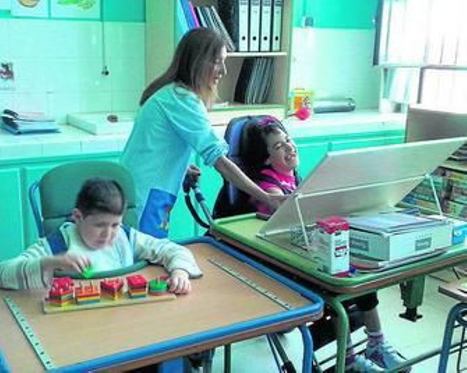 Junto con esta profesora, en el aula también está todo el día una monitora que ya tiene su plaza en el centro abderitano. Su labor también es imprescindible porque "algunos de ellos tienen una dependencia muy alta, no son nada autónomos, y tienes que darles de comer, ayudarles a ir al baño, dirigirles la tarea, etc".