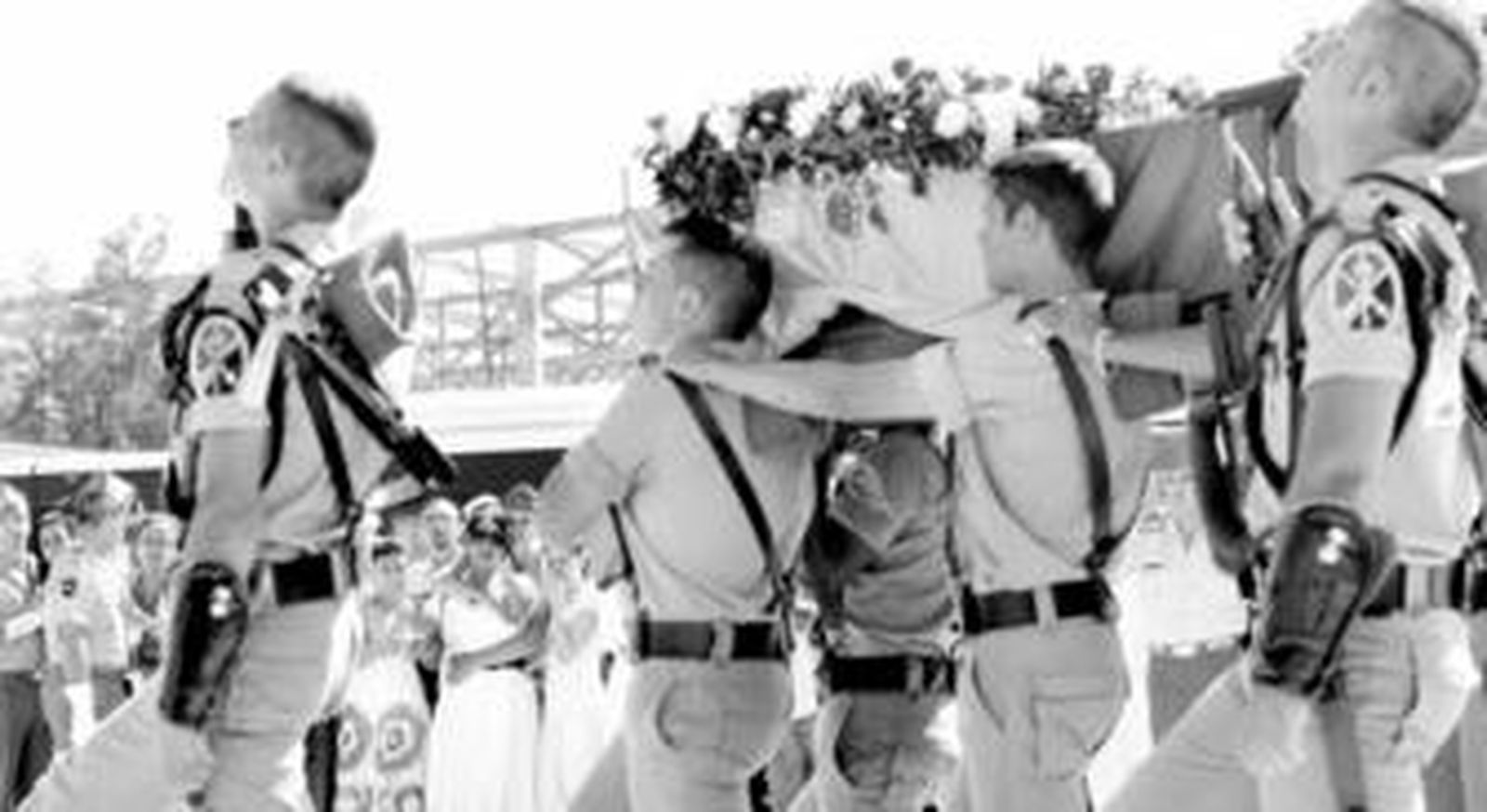 Era el momento del homenaje a los difuntos, y entraron en el patio de armas los guiones de La Legión que portaban una corona de flores colocándola al lado del féretro, mientras los compañeros de Yeison Felipe Ospina entonaban, como él ya hiciera en pasadas ocasiones, El novio de la muerte. La Banda de Guerra y Música de La Legión tocó a oración, pasando los guiones a rendir honores ante el féretro. Para terminar, la madre del cabo fallecido recibió de manos de la subsecretaria de Defensa las banderas que habían permanecido durante los aproximadamente sesenta minutos en que duró la ceremonia, sobre el ataúd.