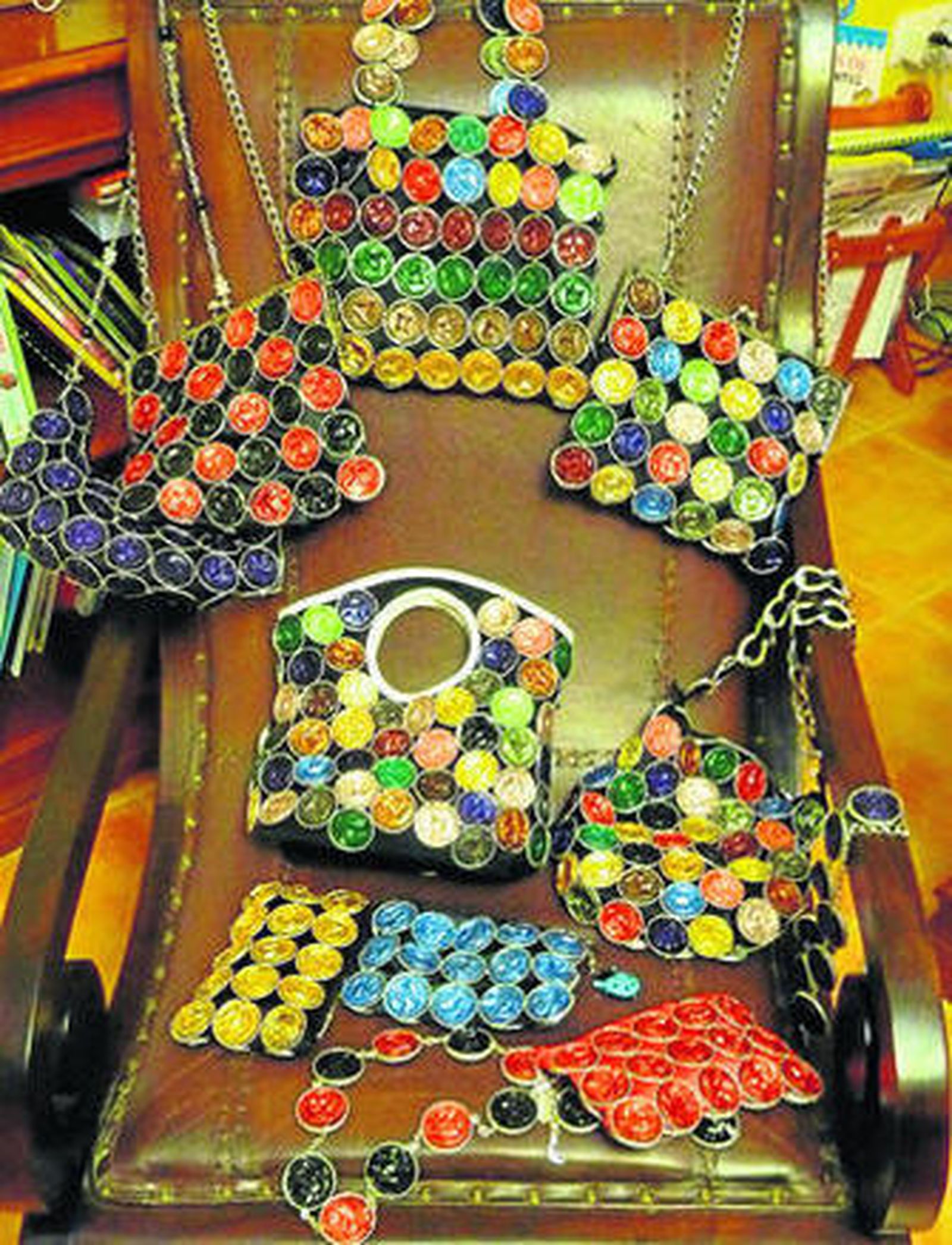 Cinturones, bolsos de fiestas, collares y anillo que elaboró por primera vez con este tipo de materiales estaban confeccionados con anillas de las latas de los refrescos con géneros de punto.