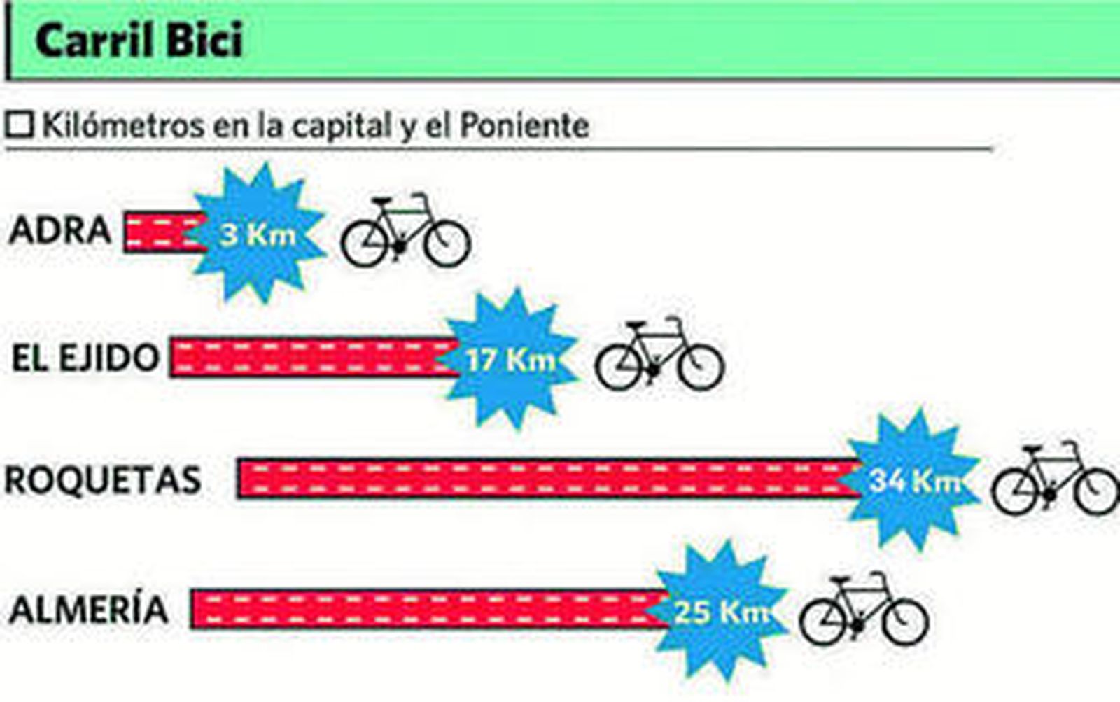 Con 35 kilómetros, Roquetas es el municipio que más vías de este tipo posee. El último proyecto de construcción de nuevas vías ciclistas se realizó en 2010. Algunas de las actuaciones se enmarcan en el proyecto Ciudad 21 de Medio Ambiente y el ayuntamiento roquetero. En 2009 la longitud existente de carriles bici en la ciudad, antes de las referidas actuaciones, era ya de 31.792 metros. De forma detallada, Roquetas de Mar disfruta de carriles bici, tanto en sentido unidireccional como bidireccional, en los Bulevares de Aguadulce y El Parador; Rambla Hortichuelas; avenida Alicún; Paseo de Los Baños; Paseo Marítimo-La Ventilla-Los Bajos-Las Salinas-La Romanilla; Puerto de Roquetas-Calle José Ojeda; Paseo Marítimo-La Bajadilla; Paseo Marítimo-Urbanización Roquetas; Urbanización Roquetas zonas verdes primera fase;Urbanización Roquetas zonas verdes segunda fase; Playa Serena; Playa Serena Sur; Cerrillos y carretera de La Mojonera.