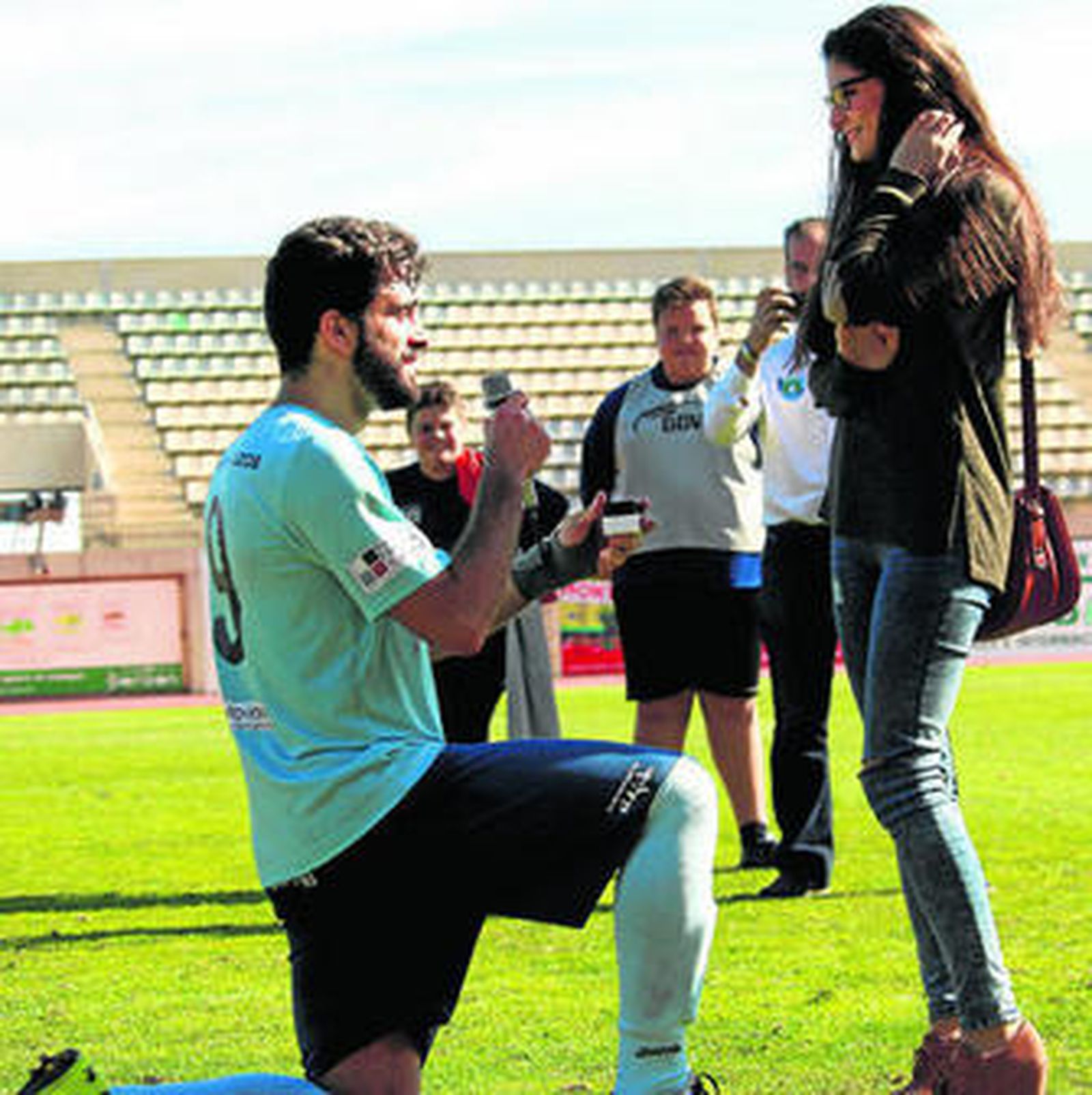 En el vídeomarcador ya se leían frases como "Gracias por estos siete años juntos. Han sido los mejores de mi vida". En la pantalla se anunciaba también que Samu tenía una pregunta que plantear a Sara y, con tales preámbulos, sólo podía ser una. El delantero del Club Deportivo El Ejido cogió el micrófono y soltó un escueto ¿quieres casarte conmigo? , mientras que su novia no salía de su asombro y no dejaba de sonreírle. La respuesta fue la esperada, le puso el anillo y se dieron tímido beso de arrancó los aplausos de todo el público asistente al partido el pasado domingo.