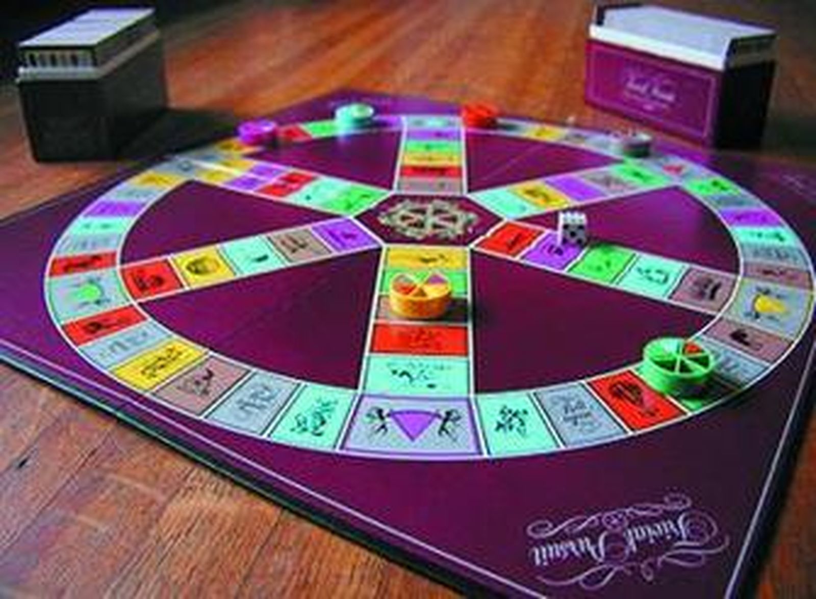 El tablero está compuesto por casillas que forman una rueda con seis radios. Cada casilla lleva el color de un tipo de preguntas, con una casilla especial de cada color en el lugar en que los radios se unen a la rueda, donde aparecen el quesito del respectivo color sostenido por dos querubines.