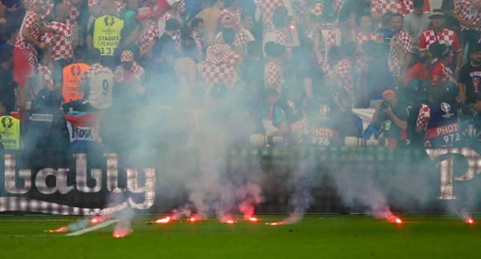 A diferencia de los rusos, los ultras croatas no protagonizaron en Saint-Etienne enfrentamientos con la afición rival, aunque lanzaron bengalas al campo, lo que obligó al árbitro a suspender el partido durante unos minutos. Las peleas entre ultras croatas, el lanzamiento de bengalas y otro material al campo, como un petardo que aturdió a uno de los responsables de seguridad, y su comportamiento racista, han motivado la sanción, aunque es menos dura que la impuesta a Rusia.