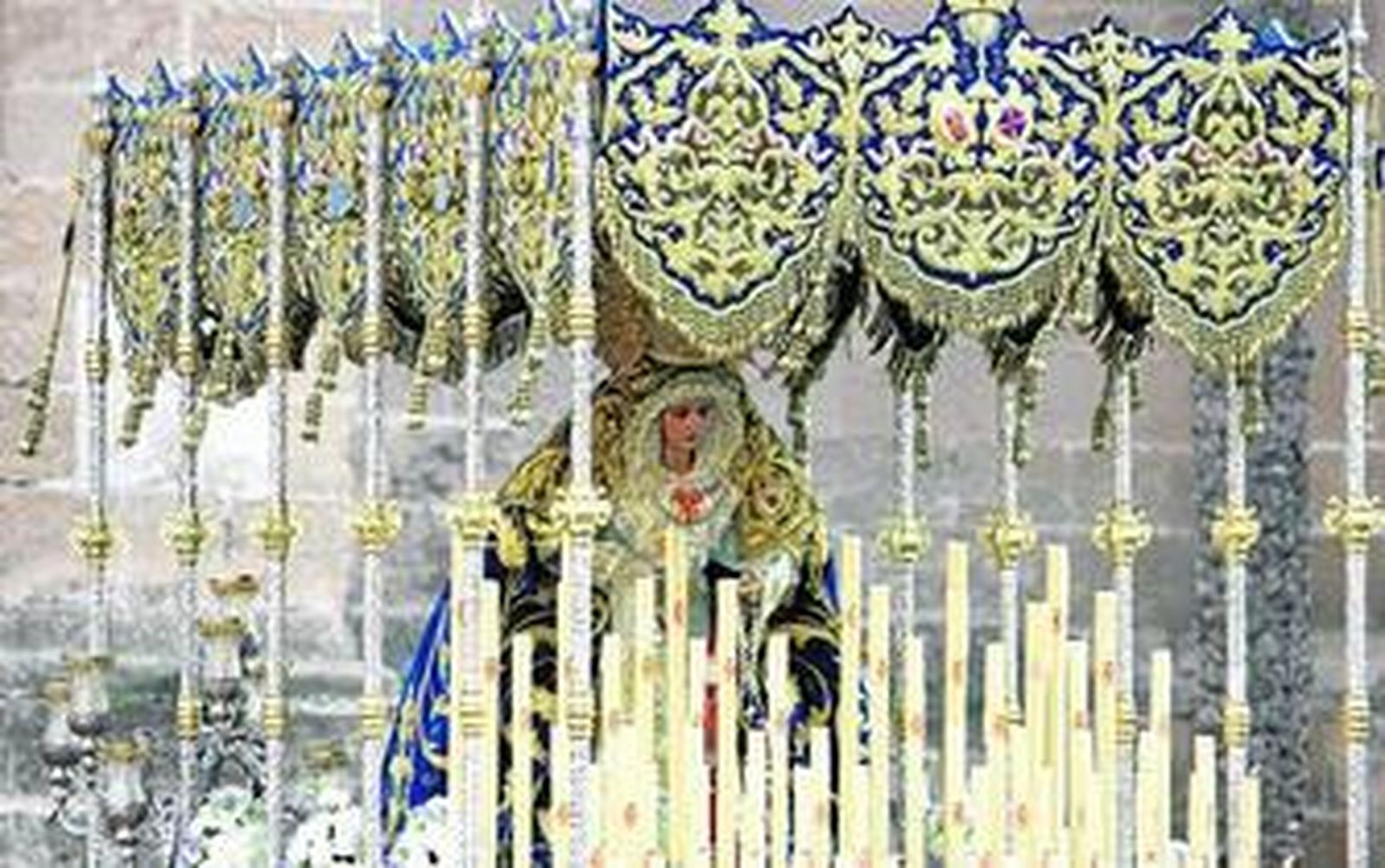 Como todo altar tiene su mesa y en ella se posan los candelabros que alumbran a María Santísima, según el diseño varía el número de ellos y la colocación, aquí el gusto de la priostía manda, y si de candelabros hablamos, los llamados de cola con su grácil movimiento encuadran la trasera del paso enlazándose entre los últimos varales.