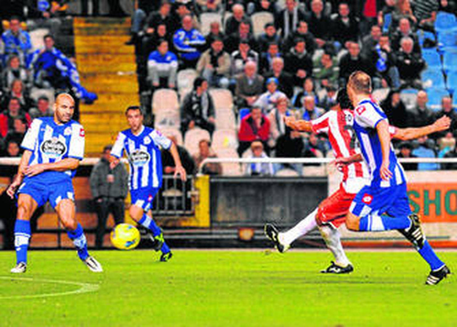 Los dos se veían ayer las caras en el duelo más morboso de la jornada. El Almería afrontaba el duelo con algo más de tranquilidad, pues tenía tres puntos más que su rival. Quizás por ello, quizás por miedo, respeto o como quieran llamarlo, los rojiblancos se metieron de inicio atrás y el balón fue del equipo de Oltra toda la primera parte. Sabedores de que los coruñeses juegan con la defensa muy adelantada, la intención era sorprenderlos en alguna contra. Pero su posesión de balón era tan escasa que no les servía ni para montar contraataques. Los almerienses estaban más pendientes de Gama, Guardado y Valerón que de atacar. Tal era así que Valdés Aller le mostró amarilla a Esteban por perder tiempo cuando no se había cumplido ni el minuto 30.