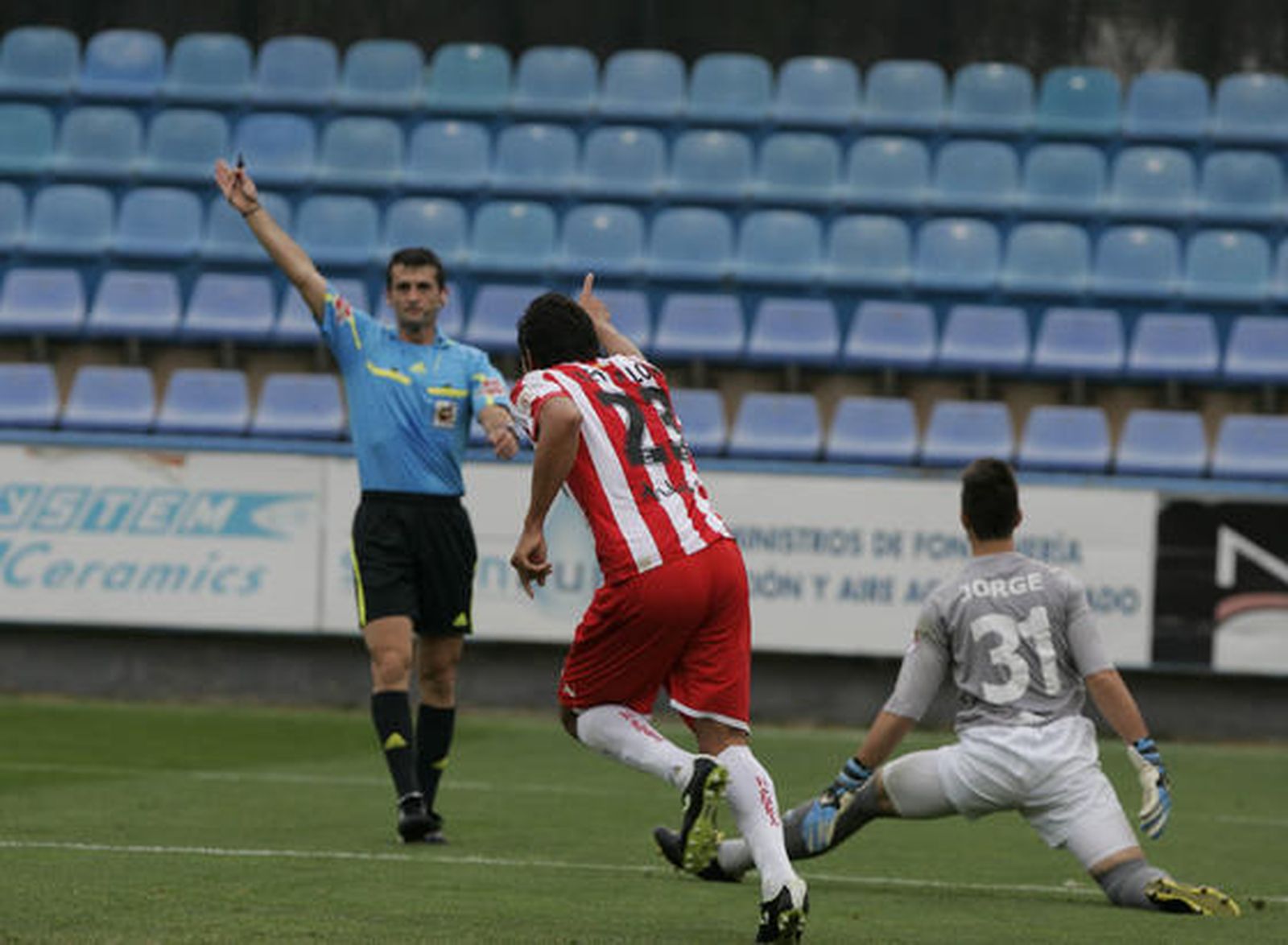 Los almerienses ya han tomado la buena costumbre de adelantarse en el marcador. A excepción de ante el Numancia, lo han hecho en el resto de partidos. Si antes ya había dado efecto, los de Alcaraz aumentaron su presencia en la media y a punto estuvieron de poner más tierra de por medio aprovechando su punta de velocidad. Jorge le sacó sendos balones que iban para dentro a Rafita y Dani Bautista. El equipo estaba cómodo en la faceta ofensiva, aunque concedía muchas faltas laterales. Cada partido es un calco del anterior, sólo faltaba saber si fotocopiadora se desgastaría de su uso.