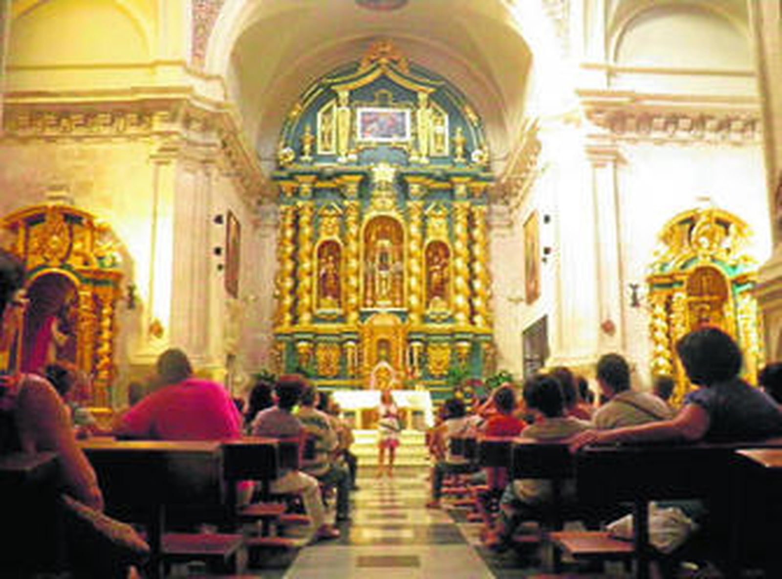 Tras bajar la calle Real, y parar frente la iglesia de San Pedro, el siguiente punto es, el Sagrado Corazón de Jesús donde las siervas de María cantan, bajo su velo blanco, los componentes de este grupo de curiosos visitantes entran al templo para contemplar el acto religioso.