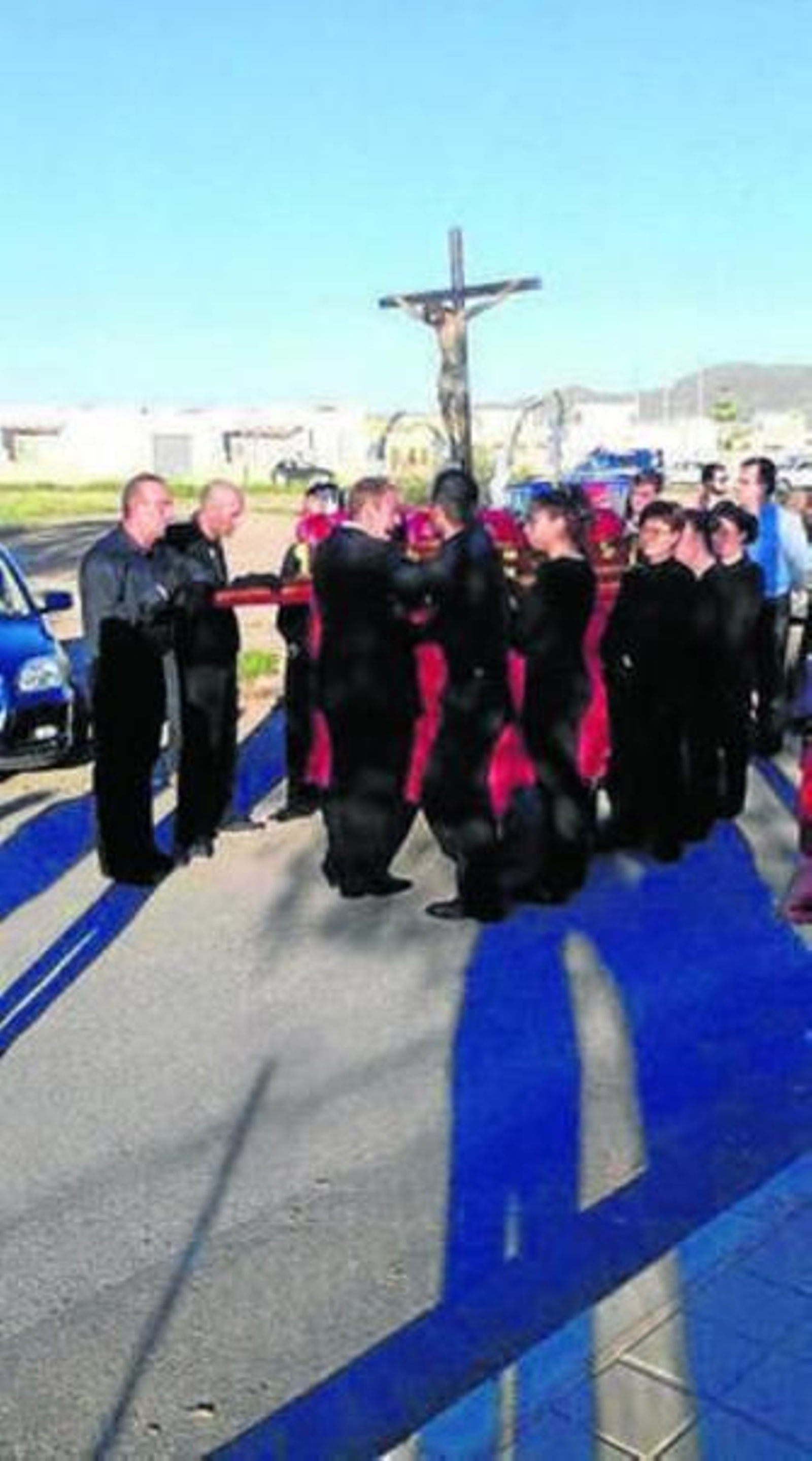 Habría el cortejo la cruz de guía en manos de un nazareno. Tras él un cuadro de mantillas que precedían al cristo, que fue portado a hombros por un grupo de andaderos. Tras el paso el párroco de San Isidro, José María Sánchez García. Ha sido él quien donó a esta parroquia la imagen del Crucificado y tras ello un grupo de parroquianos decidieron crear la Hermandad del Santísimo Cristo Crucificado.